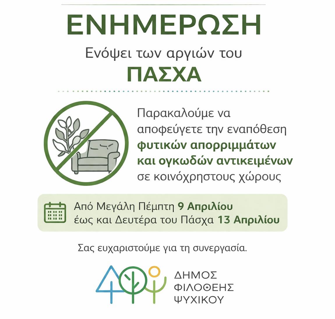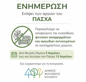 Ενόψει των αργιών του Πάσχα, ο Δήμος Φιλοθέης – Ψυχικού καλεί δημότες και κατοίκους να συμβάλουν στην καλή εικόνα της πόλης, αποφεύγοντας την εναπόθεση φυτικών απορριμμάτων και ογκωδών αντικειμένων σε κοινόχρηστους χώρους από τη Μεγάλη Πέμπτη 9 Απριλίου έως και τη Δευτέρα του Πάσχα 13 Απριλίου.