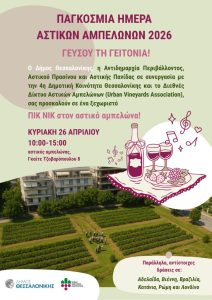 Ο Δήμος Θεσσαλονίκης, η Αντιδημαρχία Περιβάλλοντος, Αστικού Πρασίνου και Πανίδας, σε συνεργασία με την 4η Δημοτική Κοινότητα Θεσσαλονίκης και το Διεθνές Δίκτυο Αστικών Αμπελώνων (Urban Vineyards Association (UVA)), σας προσκαλούν την Κυριακή 26 Απριλίου, από τις 10:00 π.μ. έως τις 15:00 μ.μ., σε ένα ξεχωριστό πικ νικ στον Αστικό Αμπελώνα Δήμου Θεσσαλονίκης (έναντι Γκαίτε, Τζοβαροπούλου 8)