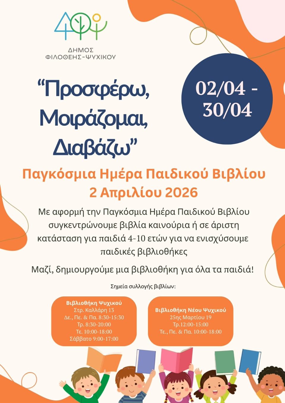 Ο Δήμος Φιλοθέης-Ψυχικού γιορτάζει την Παγκόσμια Ημέρα Παιδικού Βιβλίου και σας περιμένει να μοιραστείτε τη χαρά του διαβάσματος.