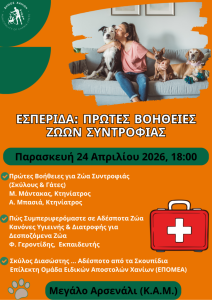 Την Παρασκευή 24 Απριλίου στις 18:00, στο Μεγάλο Αρσενάλι, θα πραγματοποιηθεί ενημερωτική εσπερίδα για την παροχή πρώτων βοηθειών σε ζώα συντροφιάς (σκύλους και γάτες), σε συνεργασία με κτηνιάτρους της πόλης και την ΕΠ.ΟΜ.Ε.Α. Χανίων.