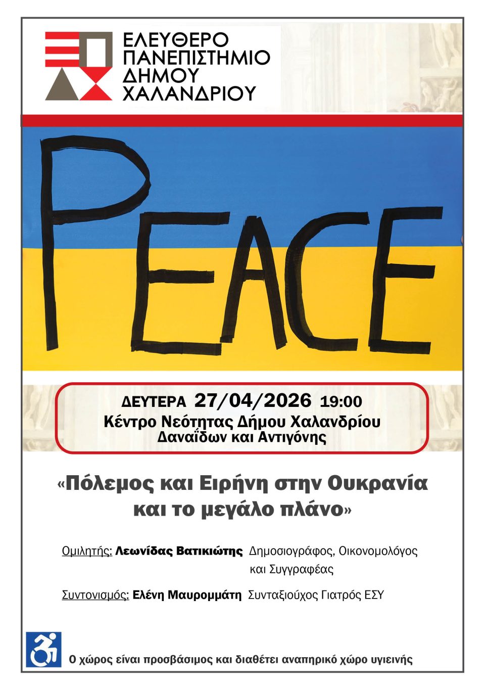 Τη  Δευτέρα 27/04/2026 και ώρα 19:00 στο Κέντρο Νεότητας (Δαναΐδων & Αντιγόνης) το Ελεύθερο Πανεπιστήμιο του Δήμου Χαλανδρίου φιλοξενεί την ενδιαφέρουσα εκδήλωση με ένα θέμα που βρίσκεται ψηλά στην διεθνή ατζέντα: «Πόλεμος και Ειρήνη στην Ουκρανία και το μεγάλο πλάνο».