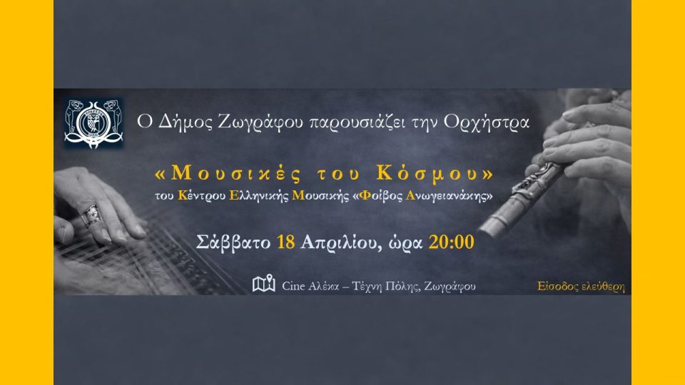 Η ορχήστρα «Μουσικές του Κόσμου» του Κέντρου Ελληνικής Μουσικής «Φοίβος Ανωγειανάκης» Κέντρο Ελληνικής Μουσικής “Φοίβος Ανωγειανάκης” ανεβαίνει στη σκηνή του Δημοτικού Κινηματογράφου ΑΛΕΚΑ για να μας παρουσιάσει ένα μουσικό ταξίδι μέσα από διαφορετικές παραδόσεις και πολιτισμούς, με «στάσεις» όπου τα ηχοχρώματα συνομιλούν και συνυπάρχουν δημιουργικά.