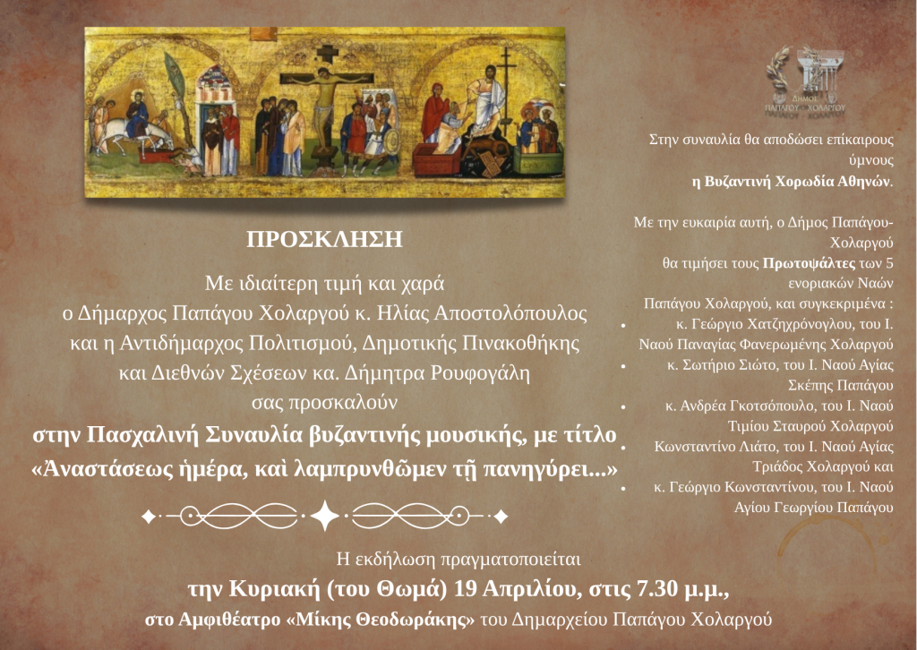 Ο Δήμος Παπάγου- Χολαργού , διοργανώνει Πασχαλινή Συναυλία Βυζαντινής Μουσικής από τη Βυζαντινή Χορωδία Αθηνών με τίτλο: «Αναστάσως ημέρα , και λαμπρυνθώμεν τη πανηγύρει….».
