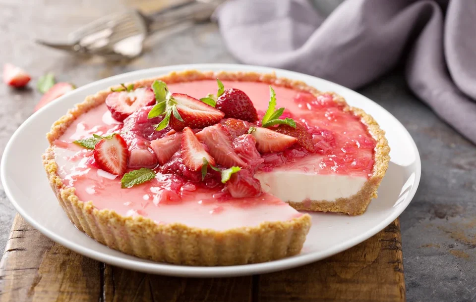 - Γαρνίρετε με φράουλες και αφήστε να παγώσει για 1 ώρα.