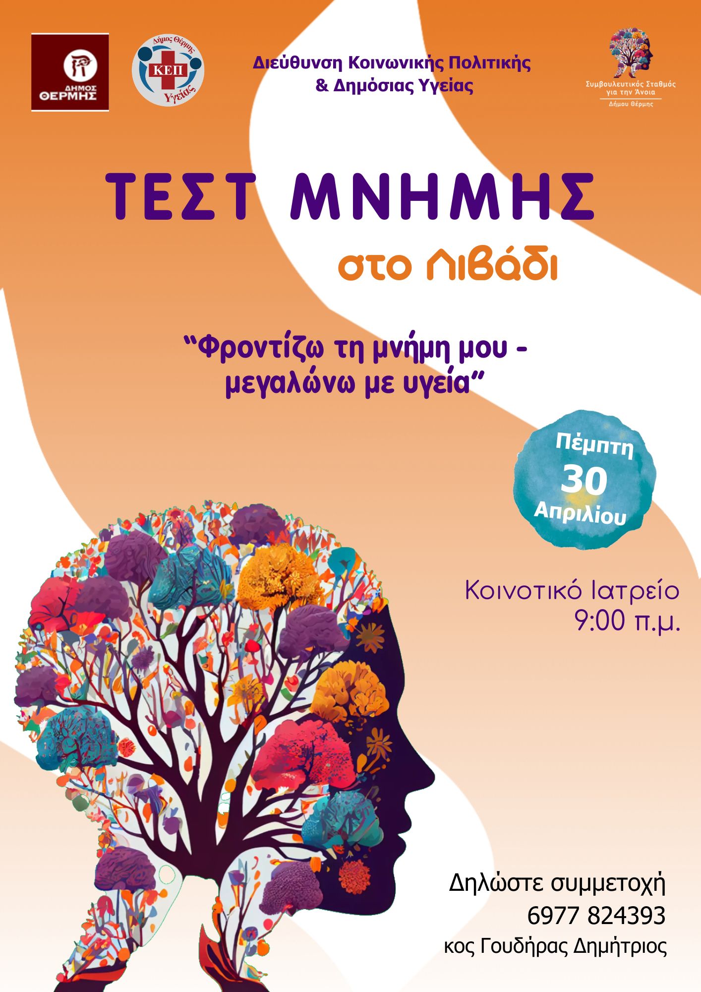 Ο Συμβουλευτικός Σταθμός για την Άνοια του Κ.Ε.Π Υγείας, της Διεύθυνσης Κοινωνικής Πολιτικής και Δημόσιας Υγείας, του Δήμου Θέρμης, διοργανώνει ΤΕΣΤ ΜΝΗΜΗΣ, την Πέμπτη 30 Απριλίου 2026 και ώρα 9.00-13.30, στην Κοινότητα Λιβαδίου. Όσοι ενδιαφέρονται να συμμετάσχουν θα πρέπει να επικοινωνήσουν με το τηλέφωνο: 6977824393 (κος Γουδήρας Δημήτριος).