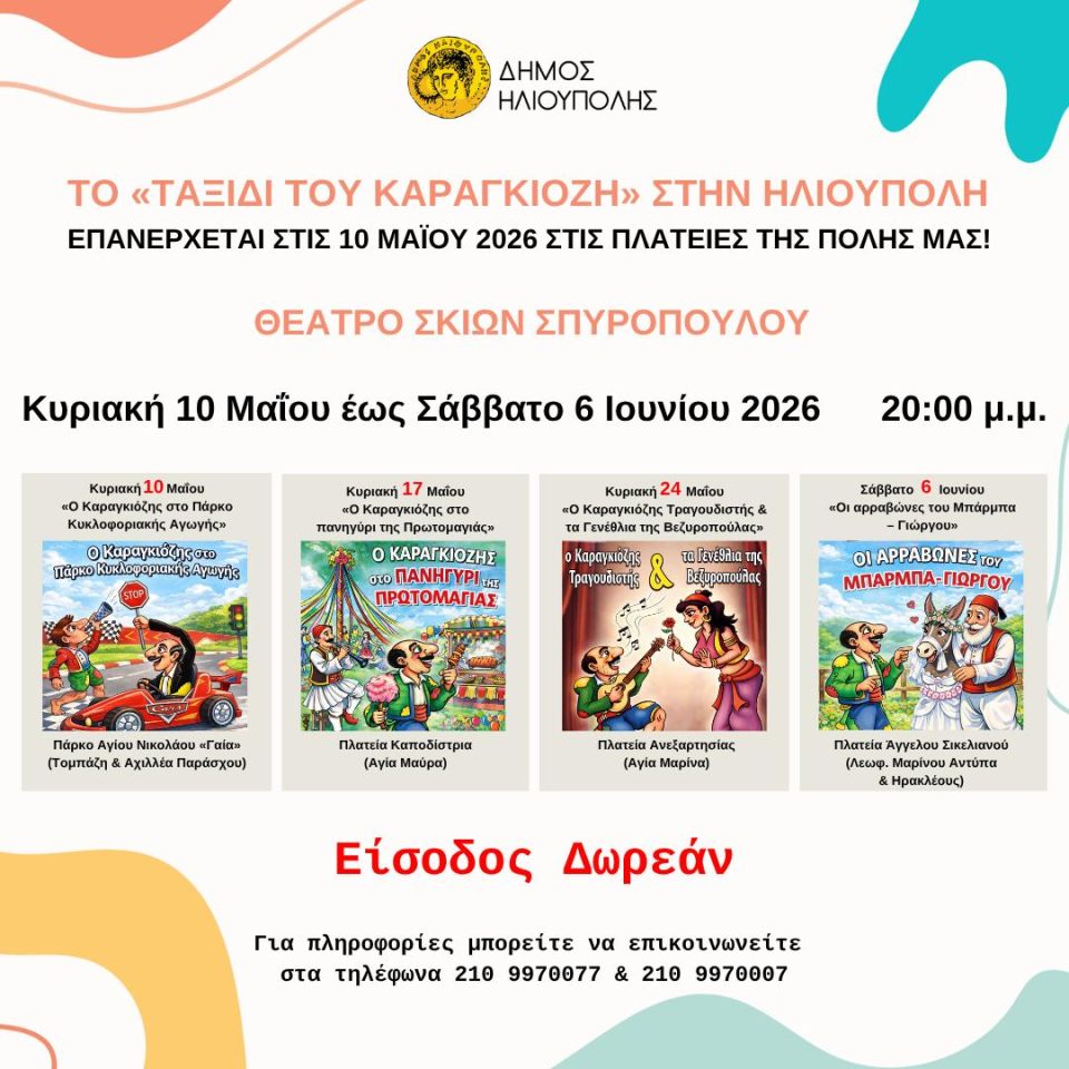 Το «Ταξίδι του Καραγκιόζη» στην Ηλιούπολη επανέρχεται στις 10 Μαΐου 2026 στις πλατείες της πόλης μας! Μία σημαντική πολιτιστική προσφορά του Δήμου Ηλιούπολης παρέα με τον αγαπημένο μας λαϊκό ήρωα