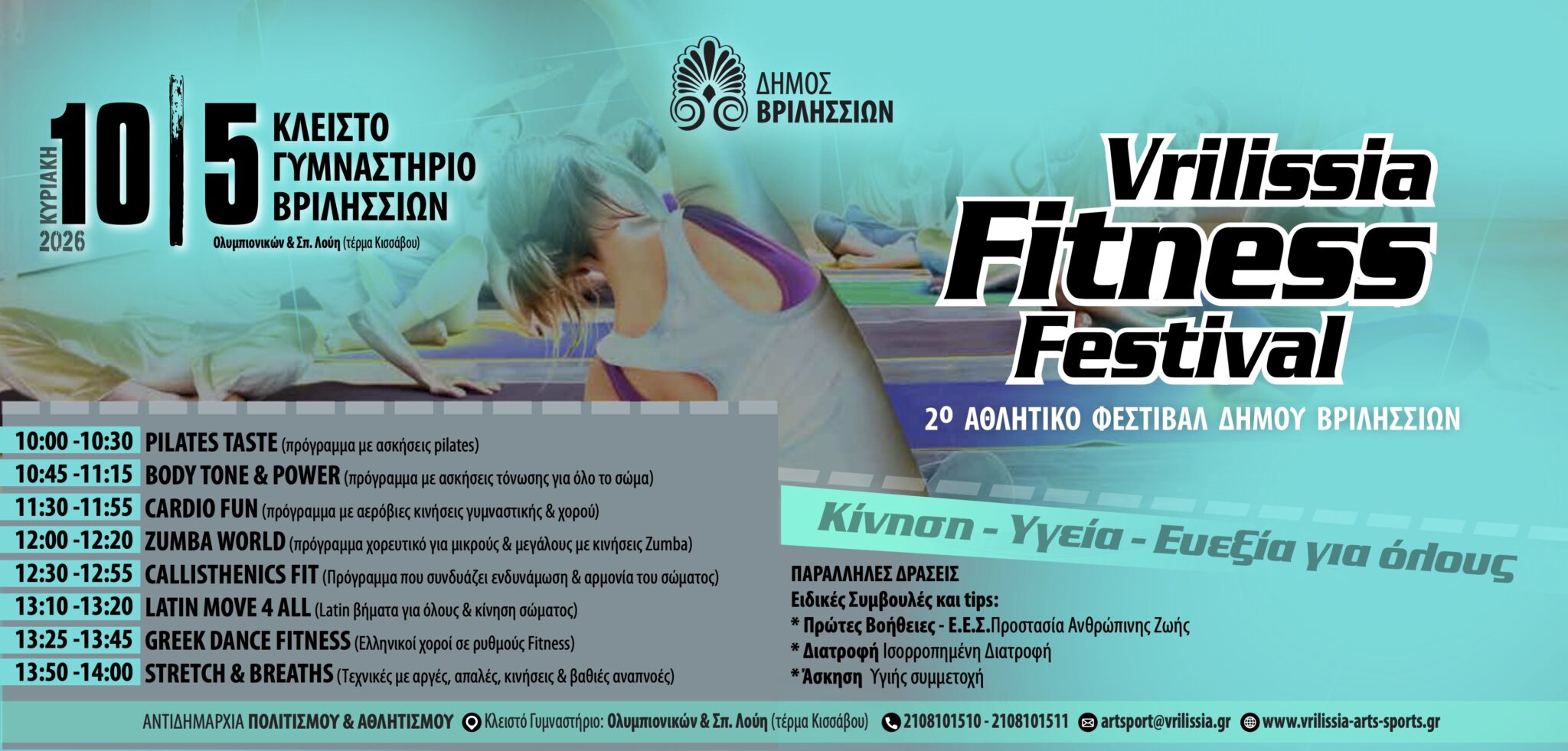 Μια μεγάλη γιορτή αφιερωμένη στον αθλητισμό, τη σωματική ευεξία και τον υγιεινό τρόπο ζωής που διοργανώνει η Αντιδημαρχία Πολιτισμού και Αθλητισμού του Δήμου Βριλησσίων την Κυριακή 10/5 από τις 10:00 το πρωί στο Κλειστό Γυμναστήριο Βριλησσίων: «Νίκος Παπαδόπουλος» (Σπ. Λούη και Ολυμπιονικών).