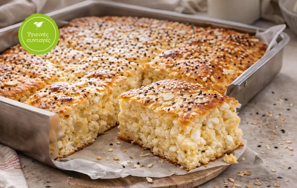 - Βήμα 2: Αλείφετε με το ελαιόλαδο ένα ταψί, αδειάζετε τον χυλό και με ένα κουτάλι μοιράζετε διάσπαρτα το cottage και το υπόλοιπο τριμμένο τυρί. Στο τέλος πασπαλίζετε την πίτα με το σουσάμι.