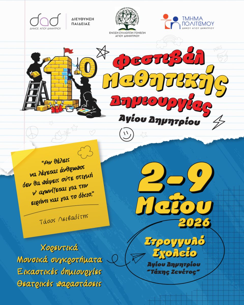 Το Τμήμα Πολιτισμού, η Διεύθυνση Παιδείας του Δήμου μας και η Ένωση Συλλόγων Γονέων Αγίου Δημητρίου, σας προσκαλούν στη μεγάλη γιορτή των σχολείων μας, όπου οι μαθητές και οι μαθήτριες δημιουργούν και μας προσκαλούν να παρακολουθήσουμε από κοντά το ταλέντο τους! Από το Σάββατο 2 Μαΐου έως και το Σάββατο 9 Μαΐου 2026, στο Στρογγυλό Σχολείο «Τάκης Ζενέτος» το πρόγραμμα περιέχει πολλά και ποικίλα θεάματα και είναι γεμάτο εκπλήξεις!