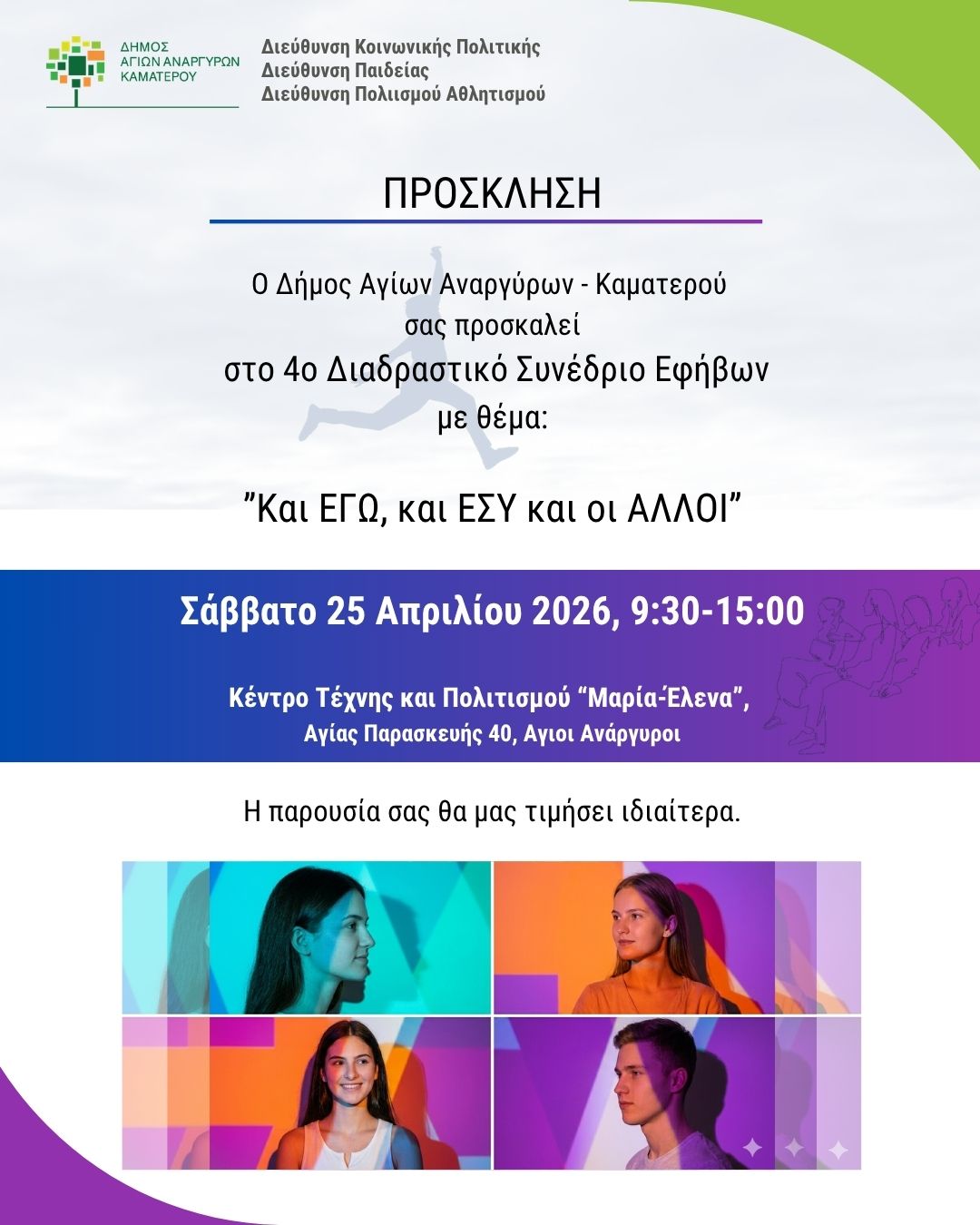Σας ενημερώνουμε ότι το Σάββατο 25 Απριλίου 2026 από τις 09.30-15.00 στο Κέντρο Τέχνης και Πολιτισμού «Μαρία- Ελενα» θα πραγματοποιηθεί το 4ο Διαδραστικό Συνέδριο Εφήβων με τη συμμετοχή ψυχολόγων, εκπαιδευτικών, κοινωνιολόγων,  μαθητών.