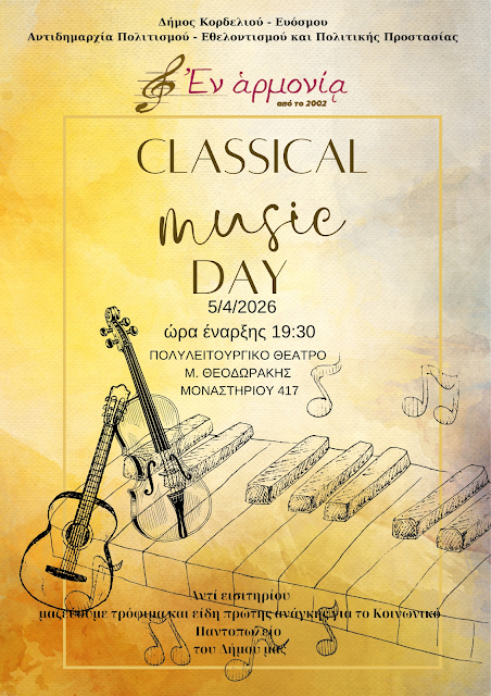 Ο Δήμος Κορδελιού – Ευόσμου, μέσω της Αντιδημαρχίας Πολιτισμού – Εθελοντισμού και Πολιτικής Προστασίας, σε συνεργασία με το Ωδείο “Εν Αρμονία”, διοργανώνουν τη μουσική εκδήλωση “Classical Music Day”.